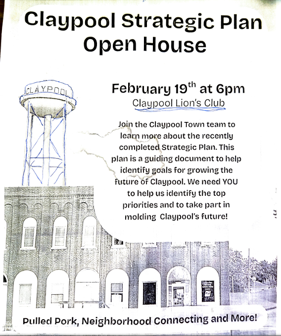 The Town of Claypool is excited to invite residents to a Strategic Plan Open House on February 19th at 6:00 PM at the Claypool Lion’s Club.